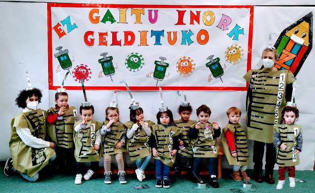 Este año el tema de carnavales ha sido el coronavirus y los más pequeños hemos ido disfrazados de vacuna.